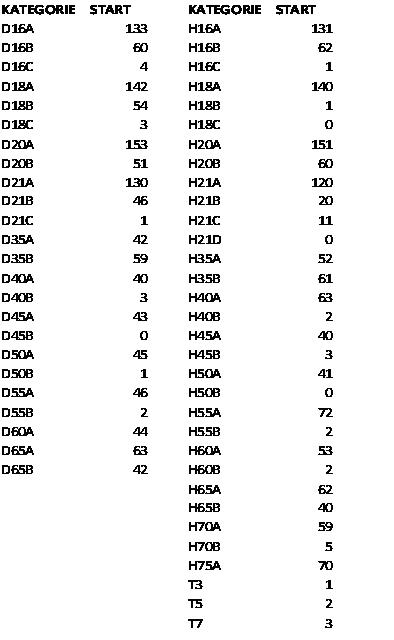 | Veteraniáda: | prvních 50%, maximálně však 25 závodníků, v případě méně než 10 startujících všichni |