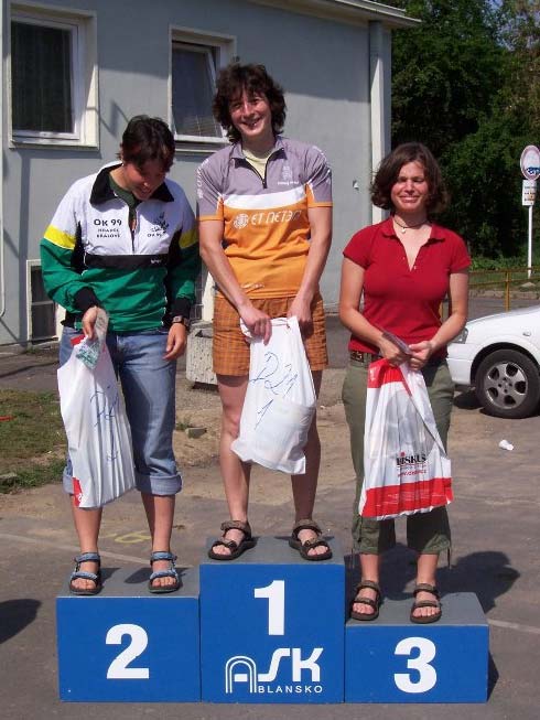 Start Blansko pořádal závody ve svém domovském městě, s centrem vzdáleným jen necelé dva kilometry od centra pohárových závodů v roce 2003. V prostoru se jelo ale jiném – tentokrát jsme se podívali do kopců západně od Blanska. Že tam jsou mnohem větší, jsme se mohli přesvědčit už na prvním postupu sobotního mistrovství republiky na dlouhé trati. To když jsme na postupu dlouhém vzdušně něco přes kilometr museli zdolat (povětšinou tlačením kola do kopce) převýšení skoro 200 metrů. Ani poté jsme se kopců nezbavili, naštěstí už se do nich stoupalo zpravidla v sedle. I když to mohlo být lepší... Sobotní závody pořádané Startem Blansko jsou prostě zakleté – podobně to dopadlo před dvěma lety v Jedovnici. Nejdřív slyším jen bouřku, pak začíná celkem příjemně pršet, ale po třetině závodu přichází prudký slejvák a jako prémie kroupy. Některé cesty se mění v bažiny, jiné v potoky. Sjízdnost dramaticky klesá – jednoznačný postup na cca 7 minut jedu za sucha o více než minutu než Sádlo, který tudy projíždí v nejprudším dešti. Krátký kopeček bez problému rychle vyjedu, on tam musel kvůli bahnu slézt z kola. Od té doby se snažím objíždět po pevných cestách všude, kde to vypadá jen trochu rozumně – tam nezpůsobí bahno takové zpomalení. Jednou jsem to trochu přehnal a udělal si skoro kilometrový výlet mimo mapu. Až na tenhle úlet se mi ale závod líbil – relativně málo kontrol, ale většina postupů nabízela více odlišných voleb, varianty mimo cesty se nevyplatily, na kole se jezdilo, jen v některých kopcích bylo třeba tlačit. Jen škoda toho počasí. To ovlivnilo i výsledky. V mužské elitě s náskokem zvítězil Rakušan Rief, který startoval dost vpředu a tak měl výhodou suché trati po větší část závodu. Český titul získal Tomeček, já jsem skončil na 17. místě. Nedělní závod na krátké trati už tak bahenní nebyl a také převýšení bylo menší, díky umístění startu nahoře na hřebeni. Trať se mi hodně líbila – střídaly se kratší úseky v hustší síti cest, kde šlo hlavně o správné odbočování ve slušné rychlosti, s úseky na volbu. V závěru pak přišel (stejně jako v sobotu) hnusný sjezd dolů do Blanska – ale tomu se stavitel vyhnout nemohl, a těsně před cílem pár kontrol v oblasti zahrádkářských kolonií. V elitě zvítězil s náskokem Ševčík, konečně se letos MTBO začalo líbit i Sádlovi, který dojel na 10. místě. Na vyhlášení výsledků měl Ekonom dva zástupce po oba dny – v D21 Martina v sobotu skončila na druhém místě (o 2 sekundy), v neděli pak už vyhrála (i když třeba na nejdelším postupu dostala od Markéty celé dvě minuty – té už se začíná dařit více i mapově, obsadila 7. místo). V kategorii veteránek byla oba dny nejrychlejší Jana Bochenková, která si MTBO vyzkoušela poprvé jinak než v kategorii příchozích a hned z toho bylo vítězství. Za zmínku stojí i Liborovo nedělní 4. místo v H21A. Stránka závodů s výsledky.