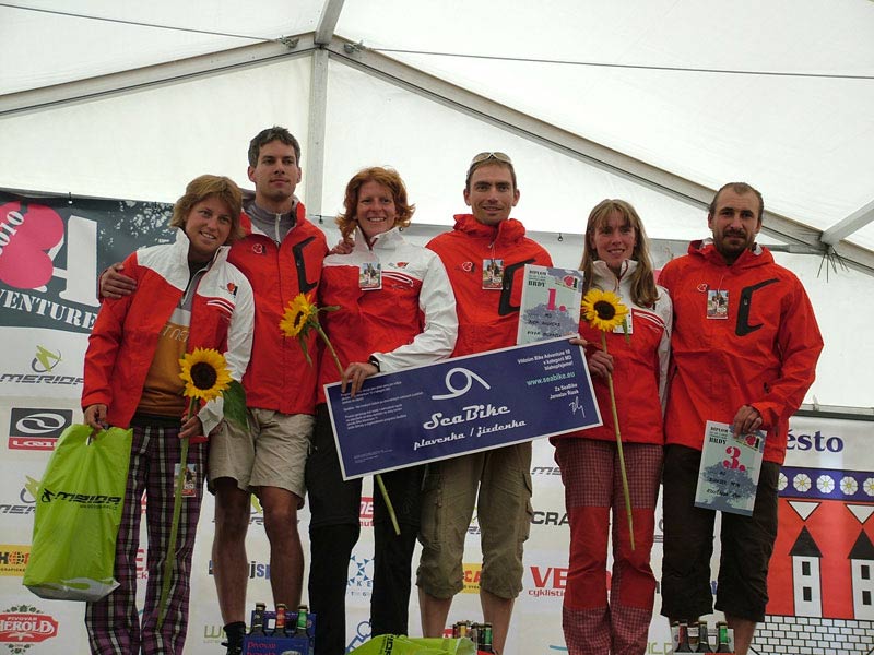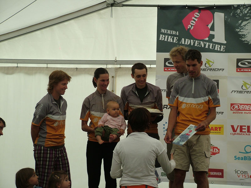 Stavba trati, tj. umístění a obodování kontrol, se mi líbila určitě nejvíc za celou historii Bike adventure. Mapa v rámci možností seděla velmi dobře, od upravené turistické mapy nemůžeme čekat zázraky v podobě klasifikace sjízdnosti. Kontroly byly rozmístěny po výrazně větší ploše, než jsme čekali, třeba s návštěvou přírodního parku Trhoň jsem původně vůbec nepočítal. Navíc těch kontrol se nacházelo na mapě 50 a tím, že jich mnoho (a často překvapivě) mělo jeden den hodnotu nula nebo 10 bodů, se myslím pořadatelům podařilo eliminovat předzávodní přípravu velkého množství závodníků. Několik kontrol za 80 bodů zas leželo tak daleko od jiných slušně obodovaných míst, takže se na ně ani jezdit nevyplácelo. Není divu, že se mi závod líbil, když se nám v sobotu s úžasně jedoucí Dášou podařilo vybrat asi nejlepší variantu z celého startovního pole (zde je GPS záznam), když vyššího bodového zisku dosáhlo jen 5 mužských dvojic. V mixech to znamenalo vedení, i když poměrně těsné. ![]() V neděli se však ukázala síla našich soupeřů – rakouští reprezentanti Andreas Rief a Michaela Gigon (která se stala mistryní světa v MTBO tolikrát, že to ani neumím spočítat) měli sice pomalejší start, takže jsme je brzy dojeli, ale dlouho jsme se jich neudrželi. Když nám pak nandali během cca 2 hodin fyzicky 18 minut na stejném postupu, měli vyhráno. Ani kdybych se vyvaroval dvou špatných rozhodnutí na konci závodu, asi by to nepomohlo (zde je GPS záznam postupů z neděle). Druhé místo, navíc relativně těsně za tak silnou dvojicí, o třídu před třetím mixem a s 10. nejvyšším bodovým ziskem v absolutním pořadí, je krásné... ale stejně, před dvěma roky v Dobříši jsem byl se třetím místem spokojenější...Soutěž týmů byla v mnohém zvláštní. V roli jasných favoritů jsme (myšleno naše dva papírově nejsilnější mixy) spolupracovali zhruba jako Astana loni na Tour de France, kde Armstrong začal Contadorovi pořádně pomáhat až ve chvíli, kdy sám neměl šanci na vítězství. Což ale vůbec nevadilo. Dokonce jsme si otestovali, že bychom uspěli i v případě, kdy by do soutěže týmů nebyly zvýhodňovány mixové a dámské dvojice přepočítávacím koeficientem. Jak ve všem ostatním pořadatele Bike adventure chválím, tak tohle se jim vůbec nepovedlo. Obecně vyvěšování výsledků bylo z pohledu dvojice startující oba dny na konci a dojíždějící po limitu ale přesto pro medaili tragické – v sobotu jsme ve vyvěšených výsledcích nefigurovali ani hodinu po dojezdu a v neděli také hodně dlouho po dojezdu se mě lidi okolo ptali, proč nejsme ve výsledcích… Průběžné výsledky týmů po sobotě pak vyvěšeny nebyly vůbec a v neděli před vyhlášením taky ne. Když pak hlasatel oznámil 2. místo - Ekonom Praha, nevěřili jsme svým uším. I s dvěma mixy mezi bodujícími bychom totiž dosáhli na druhé místo bez použití koeficientů. Na ty se bohužel zapomnělo a vyhlášeno bylo úplně nesmyslné pořadí. No co, nikdo není dokonalý, ani pořadatelé podle mého dlouhodobě nejúspěšnější orienťácké akce v ČR… Oficiální výsledky už ukazují jednoznačné vítězství Ekonomu v soutěži týmů a obhajobu loňského prvenství. Takže už máme tři a příští rok doženeme Teslu Brno ;-) Výčet solidních výsledků nekončíme – kdyby se vyhlašovala velká bedna, měli bychom na ní další čtyři dvojice. V mužích skončili čtvrtí Sádlo s Tomášem Petrečkem, ve veteránech pátí Dušan s Lybarem a šestá místa zbyla na Markétu s Míšou i Mirka se Zdeňkou Havlíkovou. Kompletní výsledky najdete na www.bike-adventure.cz.
