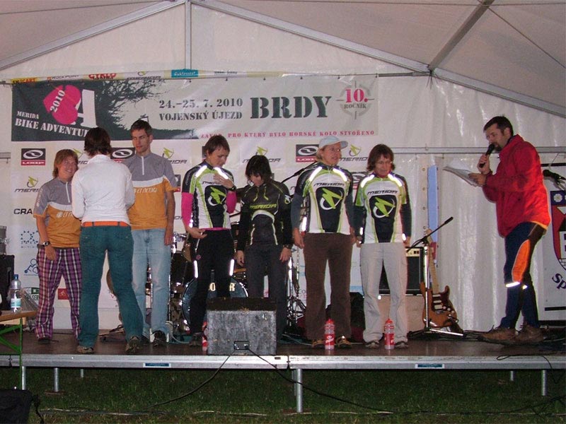 Brdman Cross je závod mnohým netypický. V první řadě tím, že je proti obdobným závodům drahý jak prase. Asi proto, že ho nepořádají orienťáci, stojí o víc než polovinu víc než třeba Bike adventure (na osobu a den). Nabízí většinou zajímavou stavbu trati a atraktivní terén. A několik specialit. Tou první je hromadný start a tzv. „žravé“ kontroly. Ty jsou oznámeny společně s bodovým ohodnocením kontrol po ostrém startu a vedle normálních bodů za danou kontrolu získávají první dvojice na dané kontrole i bonusové body - první 30, druhá 29 atd. Takže jsme vyrazili za jednou z těchto kontrol, ale asi jsme neměli moc rychlý start - brali jsme jen 23 bodů. Paradoxně na další žravé kontrole, kam jsme rozhodně nejeli přímo, na nás zbylo 24 bodů. V tu chvíli jsme ale věděli, že vítězové předchozích dvou ročníků Štěpán Skripnik s Honzou Fujáčkem zvolili obdobný postup a jsou pár minut před námi. Nic moc nezměnila ani ukradená kontrola za 80 bodů (v jejím místě byly naštěstí rozsypané lístečky), ani další speciality, bonusové kontroly na podrobných orienťáckých mapách, které v závodní turistické mapě nebyly zakresleny. Dojeli jsme z Dobříše v podstatě po hřebeni Hřebenů až nad Černolice, a pak jsme se spustili do Řevnic k Berounce (pro lepší pochopení poslouží GPS záznam trasy). Dalším cílem byla kontrola nejvzdálenější od Hřebenů, která se nacházela až skoro u Koněpruských jeskyní, dle očekávání byla také za 80 bodů. Tam bylo jasno - musíme i pro poslední osmdesátku nahoru na Kuchyňku, kam se nám před závodem vůbec nechtělo, a navíc na naše soupeře ztrácíme při stejném postupu už okolo 5 minut. Ještě méně povzbudivé porovnání přichází v nejprudším asfaltovém úseku stoupání směrem ke Kuchyňce, kde se objevují Štěpán s Honzou pod kopcem asi minutu za námi, a je jasné, že v tu chvíli stihli sebrat o 30 bodů víc než my. Dneska asi nevyhrajeme. Snažíme se ale nezpomalit, aby nás v klíčových úsecích neviděli před sebou. Postup z Kuchyňky dolů na další kontrolu (resp. dvojkontrolu s bonusem na orienťácké mapě) jsme měli také v kategorii „tam fakt nechceme, žádná cesta tam není“, ale je jasné, že do něj jít musíme. Začátek mimo cesty podle turistické mapy a pak doufat, že se vynoříme na správné cestě na orienťácké mapě. Sbíháme prudký svah pod vrcholem a pokračujeme dál po cestě z kopce. Směr má dobrý, ale je to ta správná? Je! Pokud je neporazíme tímhle, tak už nijak. Brzy razíme bonusovku a po chvíli i sousední normální kontrolu. Tam těsně po nás dojíždí naši soupeři, bonusovou kontrolu ještě mít nemohou. A teď vzhůru pro další prémiové body - další specialitou je lanové centrum, kde se dají získat další prémiové body za lezení po nějakých lanech, kontrola s lanovým centrem je na cestě do cíle. Dalším soupeřem je ale čas - zbývá 25 minut do vypršení limitu, nicméně penalizace za prvních 10 minut jsou mírné. Dvě minuty před vypršením limitu dojíždíme k lanovému centru. To je ještě včas. Na kole se mi sice jede výborně, ale na lanech je stejně únava cítit. První část trasy však zvládáme, za což nám obsluha lanového centra připisuje 25 bodů. Teď už ale musíme rychle do cíle, ať se vyhneme tvrdší penalizaci. To se dle našeho měření daří - dojíždíme necelých 8 minut po limitu. Oficiální časomíra má jiný názor, podle mého padlý na hlavu - oficiálně byl start přece v 11 hodin. Že se odstartovalo tak o 3 minuty později, asi nikoho nezajímá. Naštěstí je to jedno, obhájci vítězství přijíždějí až po nás a mají trestných bodů ještě víc. Ale i při správném počítání by bylo výsledné pořadí stejné. Díky vydařenému závěru a bonusovým bodům z lanového centra mažeme ztrátu a dostáváme se asi o 10 bodů na první místo. Ceny pro vítěze jsem sice čekal hodnotnější, ale hlavní cíl byl splněn. Na start Bike adventure se mi vždycky nastupuje líp, když se podaří závěr předchozího závodu a tím líp, když se ho podaří i vyhrát.