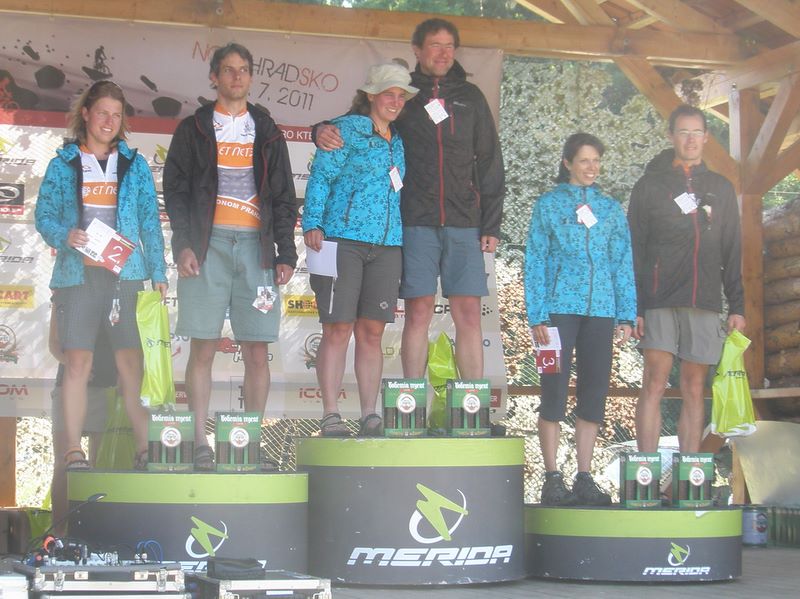Při závodě jsem zjistil, že Jizerské hory v létě jsou úplně jiné než v zimě. Zatímco na běžkách mi tamní terény nepřijdou zrovna kopcovité, na kole se dá sjet až do podhůří a stoupat odtud nahoru jako třeba z Josefova Dolu na Knajpu nebo z Mníšku do Bedřichova je celkem makačka. Tam všude jsme se podívali, jak ukazuje GPS záznam našich postupů. Cesty jsou v Jizerkách většinou asfaltové nebo zpevněné, takže ideální výbavou na závod bylo spíš trekkingové kolo - Ondra Blaha na něm jel a byl rychlejší než já (z části to bylo asi tím kolem, z části něčím jiným). Konkurence se v kategorii mužských dvojic sešla silná, takže jsme s jedním defektem a pár chybami obsadili 9. místo, Dušan s Honzou Kabátem skočili hned za námi. Závodu se zúčastnilo přes 200 závodníků, což je slušný počet na to, že Mirek byl asi jediným pořadatelem na plný úvazek - Markéta totiž byla nemocná a ostatní pomocníci buď různě přijížděli a odjížděli, nebo vedle výpomoci s pořádáním ještě závodili.