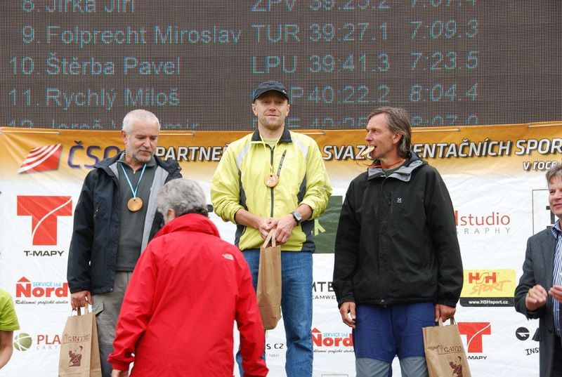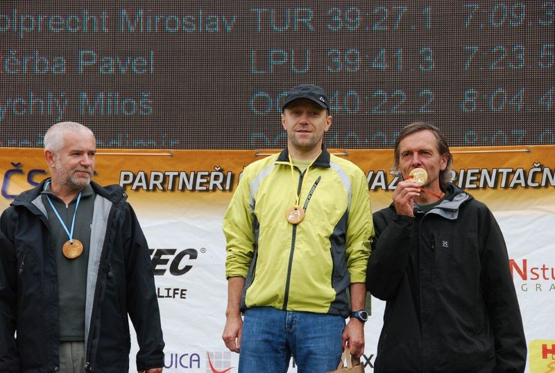 Docela pěkný terén, různorodý, plný detailů, mapa tak akorát přesná a akorát generalizovaná. Tratě náročné na koncentraci a rychlé myšlení, rychlé mapování, přesné realizace postupů a jisté dohledávky. Zcela nečekaně zvítězil Béža v prestižní kategorii H55 a stal se na stará kolena poprvé (veteránským) mistrem republiky. Jako obvykle se na start sotva dobelhal, ale se startovním výstřelem vyrazil do lesa jako mladý srnec a všechny své zkušené a medailemi ze světových kolbišť ověšené soupeře spráskal. Stříbro do rodiny přidala Mirka v D50 po bezchybném výkonu ve finále. Mladému Béžovi pak už nezbylo nic jiného než přepustit svým soupeřům v elitě první dvě místa a doplnit rodinnou sbírku bronzem. Další nečekané stříbro v H35 patří ušákovi v barvách Náchoda Čendovi Sokolářovi. Velmi mu ho přejeme. Je to taková slabá náplast na zdravotní trápení, které ho už skoro rok pronásleduje. Úspěšné tažení doplnili Peciš, Kucan a Líba umístěními v první desítce. A ještě taková perlička od jednoho z našich veteránů, kde udělali soudruzi z NDR chybu:ve finále MČR KT startovaly kategorie H45A, H50A a H55A vždy ve stejné minutě. Běžel jsem H50A a na lajně si jen tak ze cviku porovnávám první kontrolu s Kucanem (H45A) a Béďou Klimplem (H55A) a ejhle - co to nevidí mé bystré oko - ona je ve všech třech kategoriích stejná! A druhá taky. A třetí taky, a čtvrtá rovněž!!! Kucan mi sice utekl hned cestou na dvojku, ale troufám si říct, že regulérnost závodu utrpěla značný šrám.